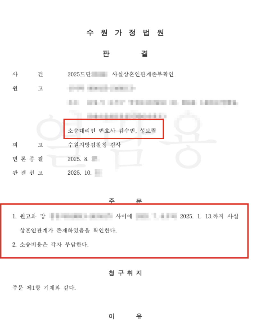 [사실혼관계존재확인/전부승소] 사실혼 관계를 판결로서 인정받은 사안